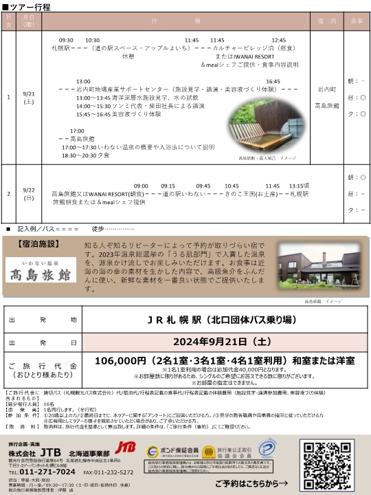 観光・イベント情報 2024.08.09 「岩内海洋深層水」美と健康ツアー募集中! ツアー詳細はこちら ご予約はこちらから 岩内町のふるさと納税でも大変人気な岩内海洋深層水を使用した化粧水を販売している(株)meethとコラボした『化粧水の源「岩内海洋深層水」と美と健康ツアー』が募集です! ツアーでは、meeth社ソンミ代表も参加されます! 主なツアー内容は ・化粧水の製造元のベル・クール研究所の柴田社長の特別講演特別な化粧水づくり体験 ・mealシェフによる食事 ・2024年温泉総選挙「うる肌部門入賞」のいわない温泉高島旅館に宿泊 皆様からのご応募をお待ちしております!